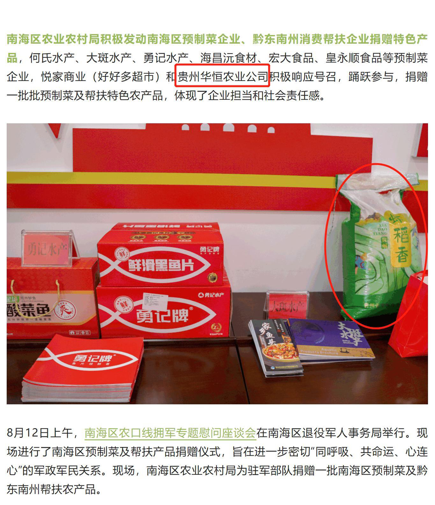 貴州華恒農(nóng)業(yè)積極響應(yīng)政府號(hào)召,積極擁軍,踴躍參與佛山市南海區(qū)農(nóng)業(yè)農(nóng)村局為駐軍部隊(duì)籌辦的預(yù)制菜及幫扶產(chǎn)品捐贈(zèng)活動(dòng)(貴州華恒農(nóng)業(yè)累計(jì)捐贈(zèng)10萬元大米和農(nóng)特產(chǎn)品)